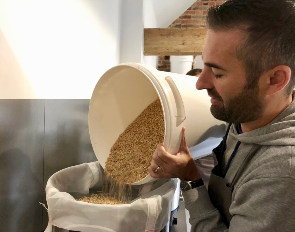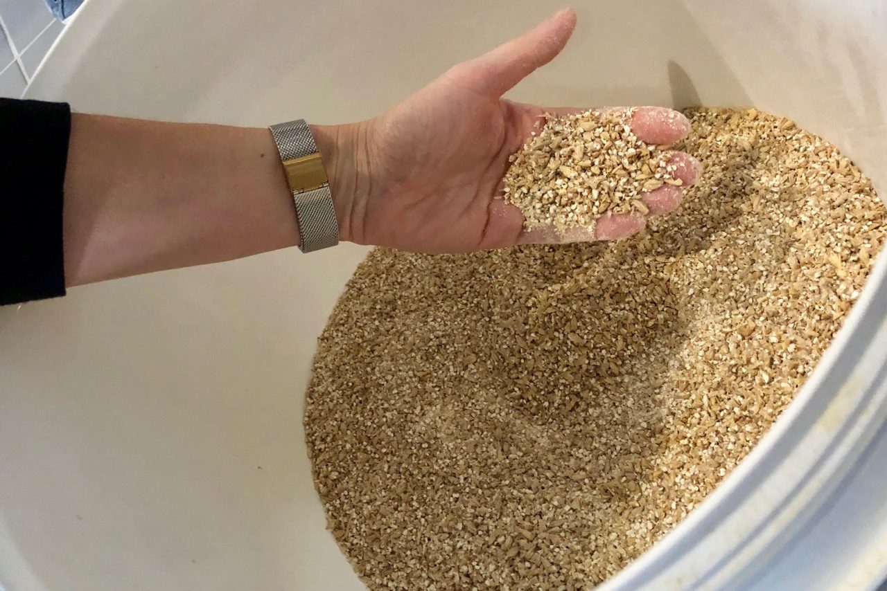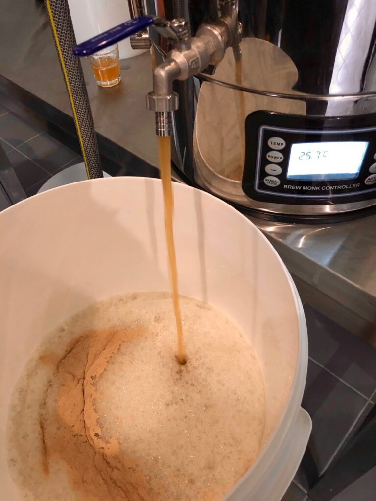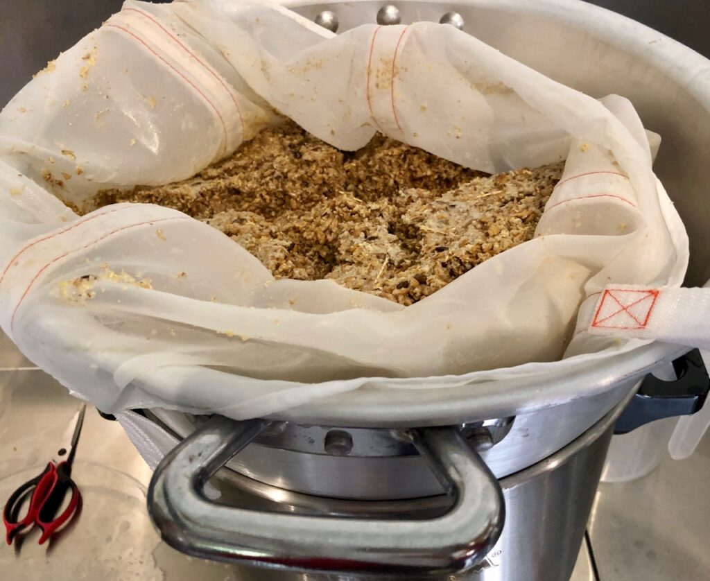 Après une heure, on sort le « sac à malt » et on procède à un bon rinçage, avec 6 litres d’eau à 75° (c’est précis, hein ?). Ce rinçage permet de récupérer le sucre piégé dans les céréales, qui ressemblent désormais à une bouillie (aussi appelée drêches). Ce jus sucré sera ajouté au reste du liquide contenu dans la cuve.