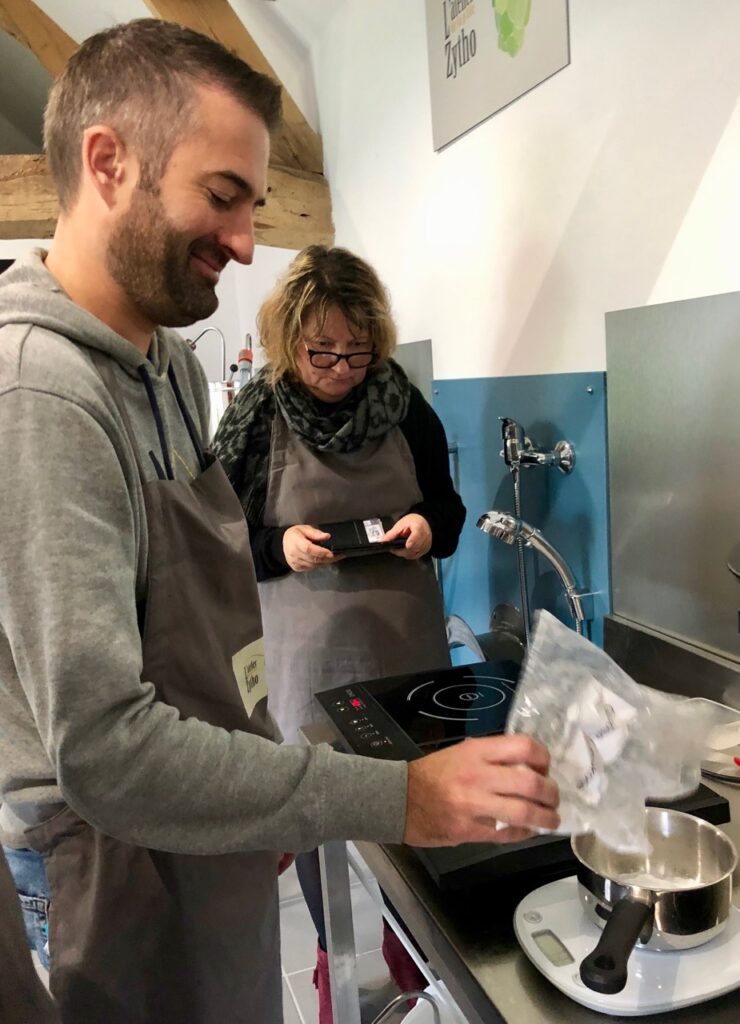 Estelle, qui travaille toujours sur plusieurs brassins à la fois, avait préparé un autre fermenteur, juste à point celui-ci pour la fin de notre atelier. Il ne restait plus qu’à y ajouter 105 grammes de glucose, délayé dans de l’eau, pour finir de faire sa bière. Du sucre qui permet la « carbonatation », à savoir la réaction chimique qui fait les bulles indispensables à une bonne bière. Mais pas avant de faire bouillir pour bien aseptiser.