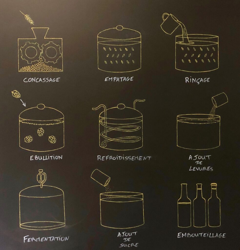 Du coup, elle a noté les grandes étapes du brassage sur un tableau noir, auquel on se référera souvent au cours de l’atelier…