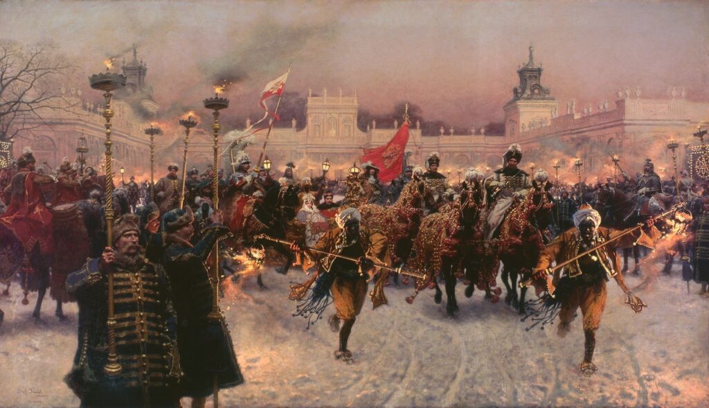 Et voici mon tableau préféré, qui glorifie à sa manière la valeureuse Pologne. Il est signé Józef Brandt et met en scène le roi Jean III, héros national après ses victoires contre l’Empire ottoman. Par une froide soirée d’hiver, il sort avec son épouse en traineau pour une petite balade dans la campagne enneigée… Les subtils coloris, le jeu d’ombres et de lumières, les nombreux serviteurs autour de lui : tout indique le prestige du monarque et le glorifie en même temps…