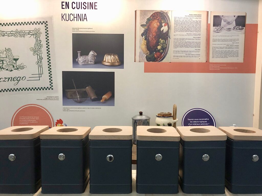 S’il y a beaucoup à lire tout au long de cette expo Pologne, il y a aussi des images d’archives à visionner, du Stéphane Kubiak et autres musiques de bal à écouter, et des parfums de cuisine polonaise à humer et à reconnaître. Enfermés dans des boîtes, arômes de sauge, d’aneth ou de cumin jouent à cache-cache…