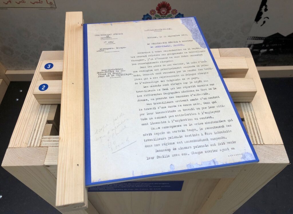 En deux salles, cette expo Pologne (ou plutôt Polonia) réussit à faire un tour complet ou presque de la question ! De la Convention d’immigration de 1919 à l’entrée de la Pologne dans l’Union européenne, il y a les grandes dates, les grands événements, les grandes problématiques et aussi tout ce qui fait la vie, tout simplement… Le chemin de l’exode, l’arrivée en France, le travail à la mine, dans les champs ou les usines textiles, l’engagement syndical, les grandes grèves, la vie dans les corons, la Seconde Guerre mondiale, les fêtes et cérémonies, la vie associative… et j’en passe évidemment.