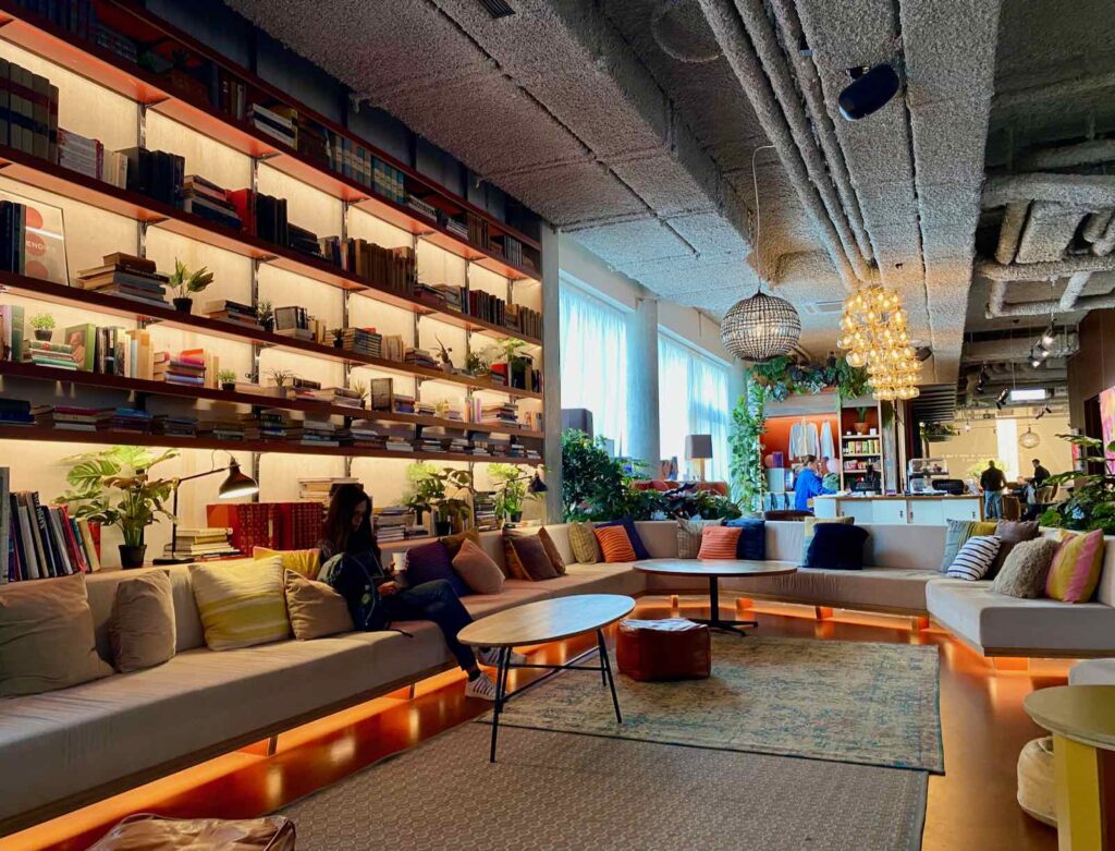 J’aime beaucoup l’immense réception, aménagée en mode salon/bibliothèque, avec son canapé XXL et ses jolis éclairages.