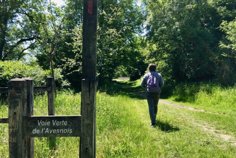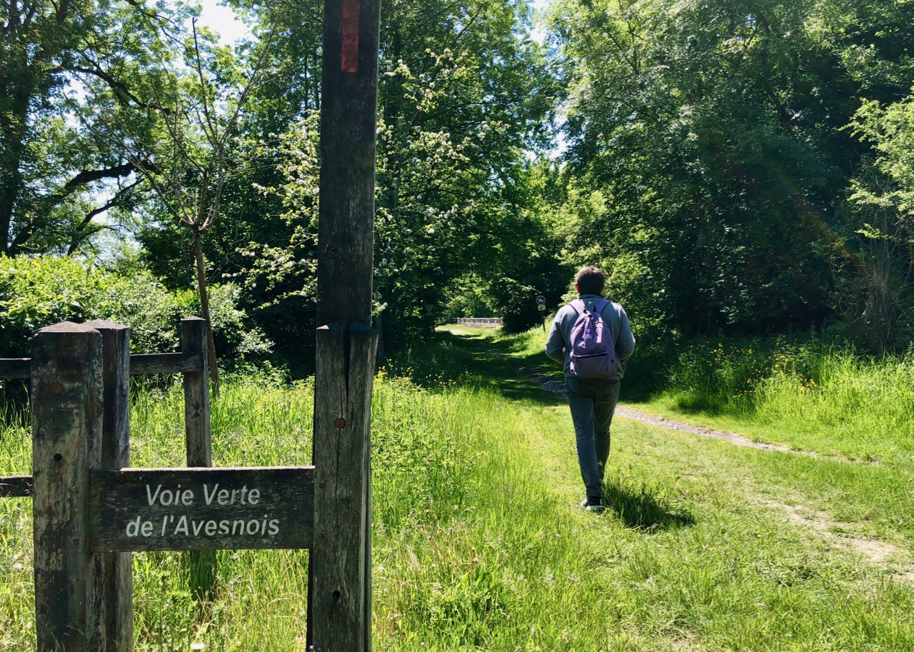 Un petit bout de chemin (je n’ai pas trop le sens des distances mais vous suivez le parcours sur votre portable, hein ?), puis on tourne à gauche sur la voie verte de l’Avesnois. Quel calme ! Quelle sérénité ! Seuls les chants des oiseaux nous accompagnent dans le sous-bois.