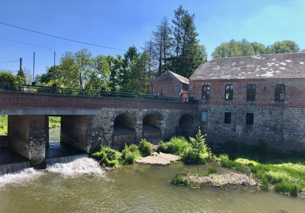 Le temps d’admirer le pittoresque moulin de l’abbaye de Liessies, en pierre bleue et brique, et son pont qui enjambe l’Helpe Majeure (juste avant l’impasse du Culot) et en avant !