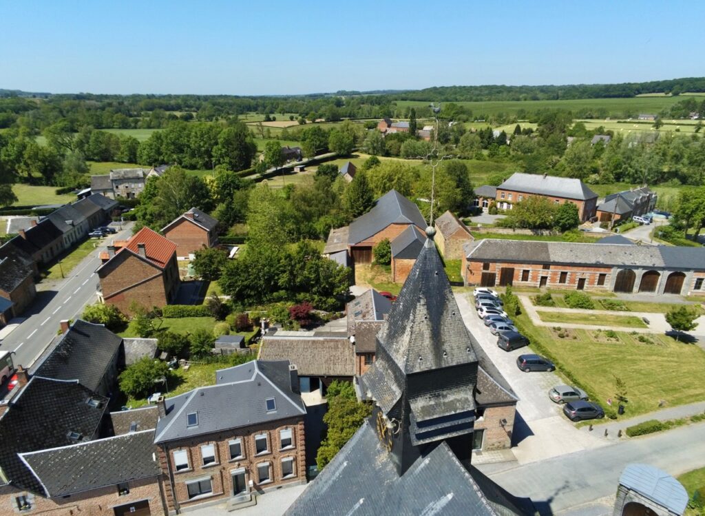 Et puis voici aussi une photo faite au drone, au-dessus du toit, avec vue sur le clocher mais aussi sur les écuries de l’ancienne abbaye de Liessies.