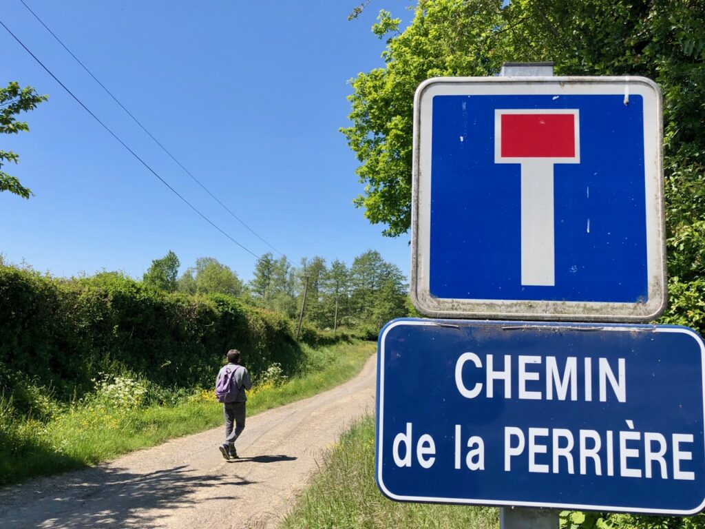 On revient sur ses pas en remontant la rue de l’Helpe et on part à droite sur la rue Roger Salengro (la D963). Juste après le cimetière, on quitte la route et on s’engage à gauche sur le chemin de la Perrière.