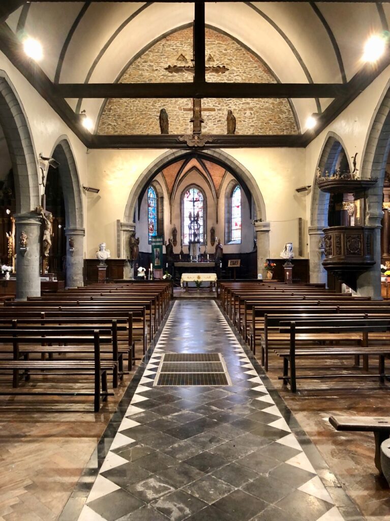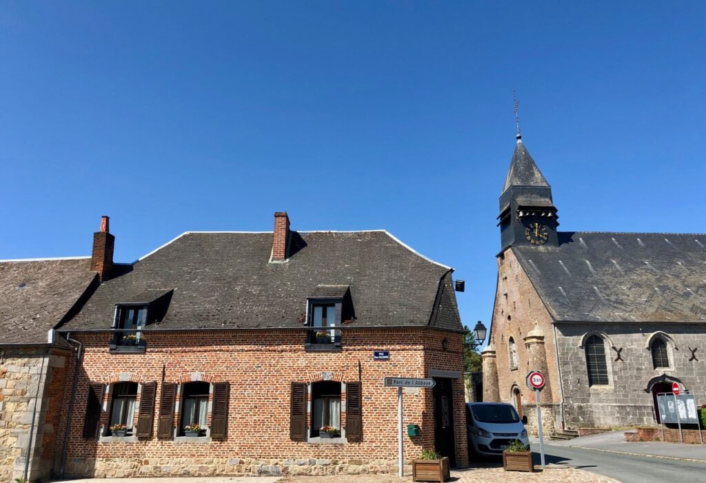 Encore un chemin qui monte (un peu) et là, on devrait normalement tourner à droite pour entrer dans le parc de l’abbaye. Mais comme il est fermé à cause du Covid-19, on continue sur le même chemin (merci la géolocalisation !), avant de tourner à droite sur la rue Sainte-Hiltrude. Puis de prendre une seconde fois à droite pour emprunter la rue du Maréchal Foch et entrer dans le bourg de Liessies. On passe devant la mairie et, en continuant toujours tout droit, voici la jolie église (Sainte-Hiltrude ou Saint-Jean ? Les guides et les sites divergent…) qui fait partie des églises fortifiées de l’Avesnois.