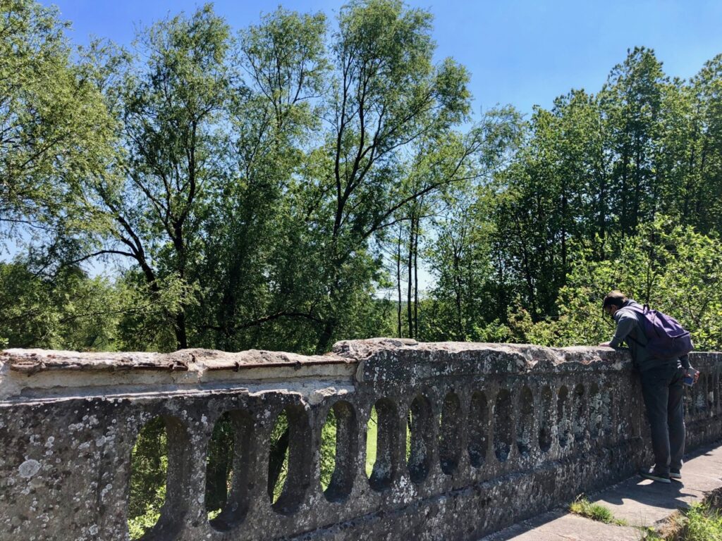 On traverse un vieux pont en pierre qui enjambe, lui aussi, l’Helpe Majeure. La voie verte suit toujours le sous-bois, au milieu d’arbres dont la cime joue à cache-cache avec le soleil.