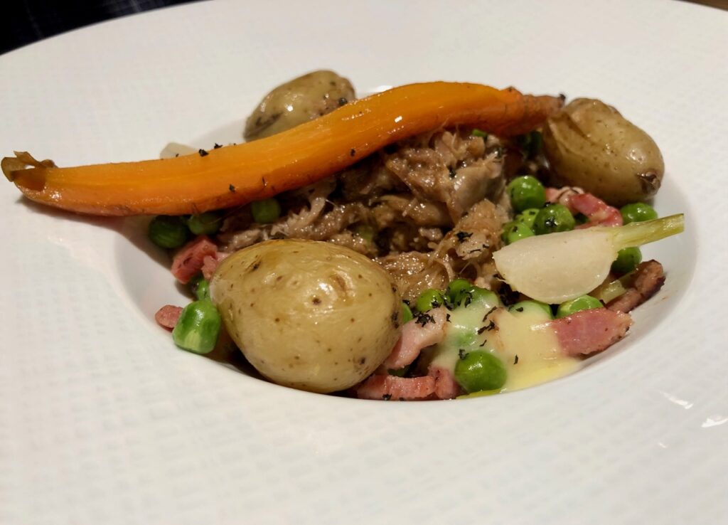 En plat, nous nous sommes partagés entre la volaille et « l’agneau, petits pois à la française et pommes grenaille ». Combien de temps ce dernier avait-il cuit ? Des heures sans doute ! Éric Delerue aime les plats mijotés et le prouve avec cet agneau merveilleusement fondant…