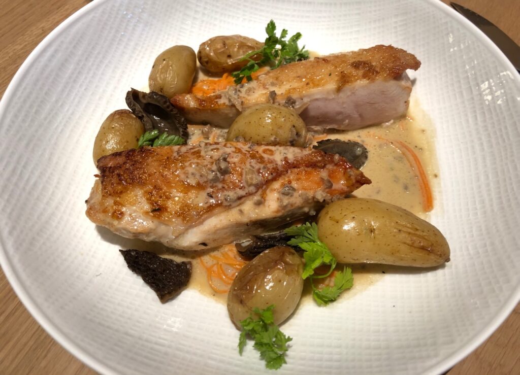 Perso, j’ai opté pour le « risotto, asperges, volaille », et je n’ai pas été la seule à apprécier cette entrée gourmande. Je n’ai pas demandé d’où venaient les asperges. Mais, en pleine saison, sûr qu’il s’agit d’une production locale ou régionale. Le chef veut mettre à l’honneur les circuits courts, au Cerisier en ville mais aussi à La Griotte. Et met un point d’honneur à cuisiner des produits livrés le matin même…