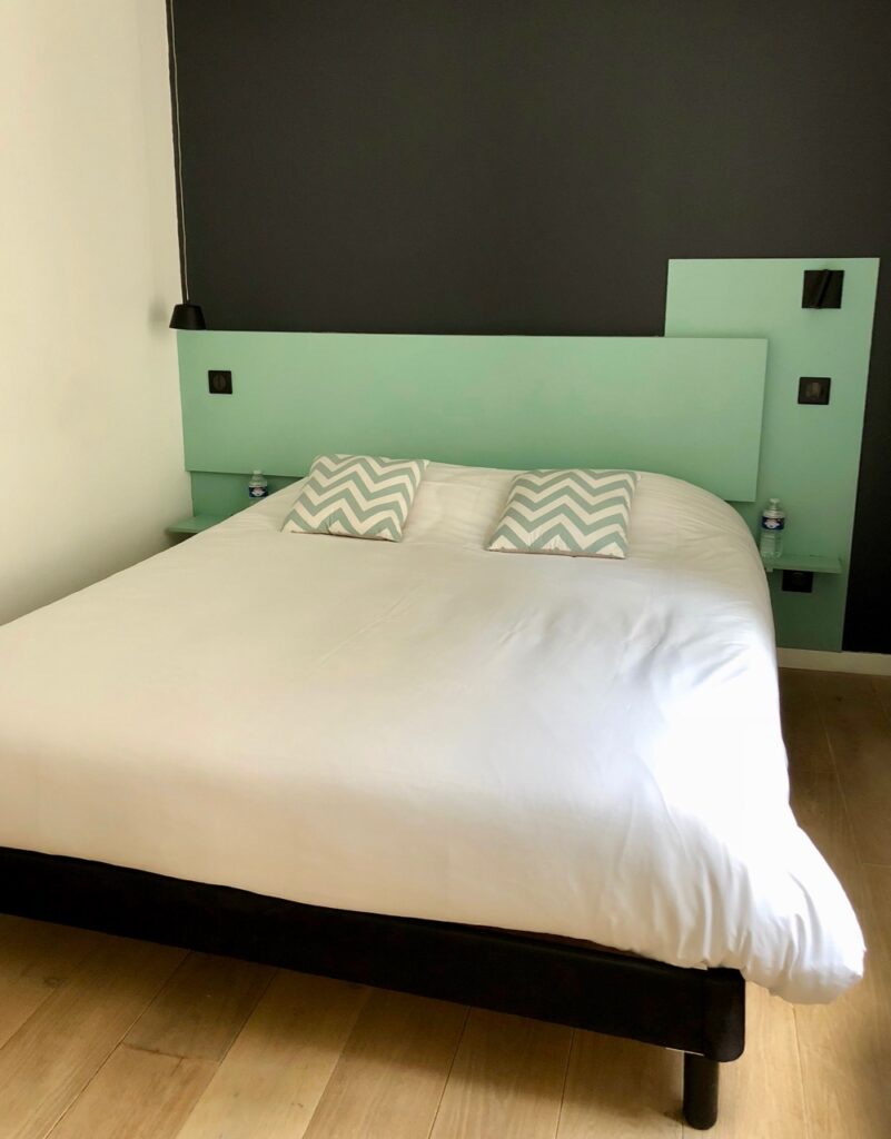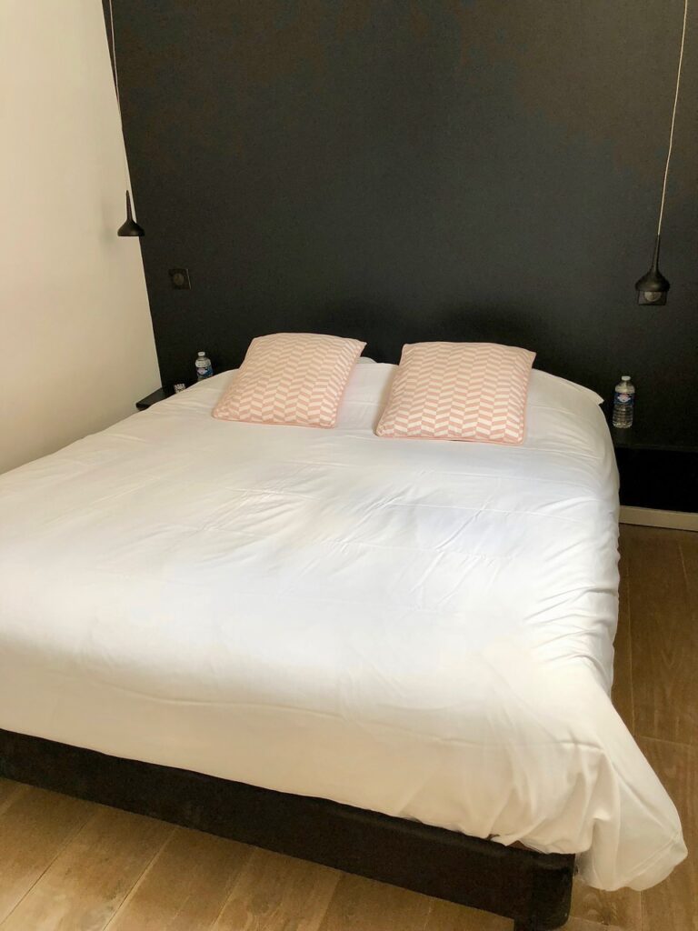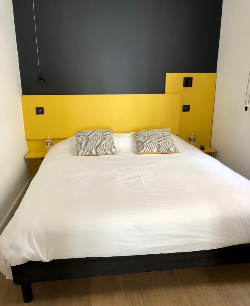 En revanche, j’ai mis en boîte la chambre du Vauban, avec sa tête de lit jaune citron sur fond noir. Là, comme partout, les propriétaires ont choisi une literie haut de gamme. Je n’ai pas testé pour vous donner mon avis. Mais j’ai vu sur le site du Chat qui dort qu’ils insistent bien sur cette qualité.