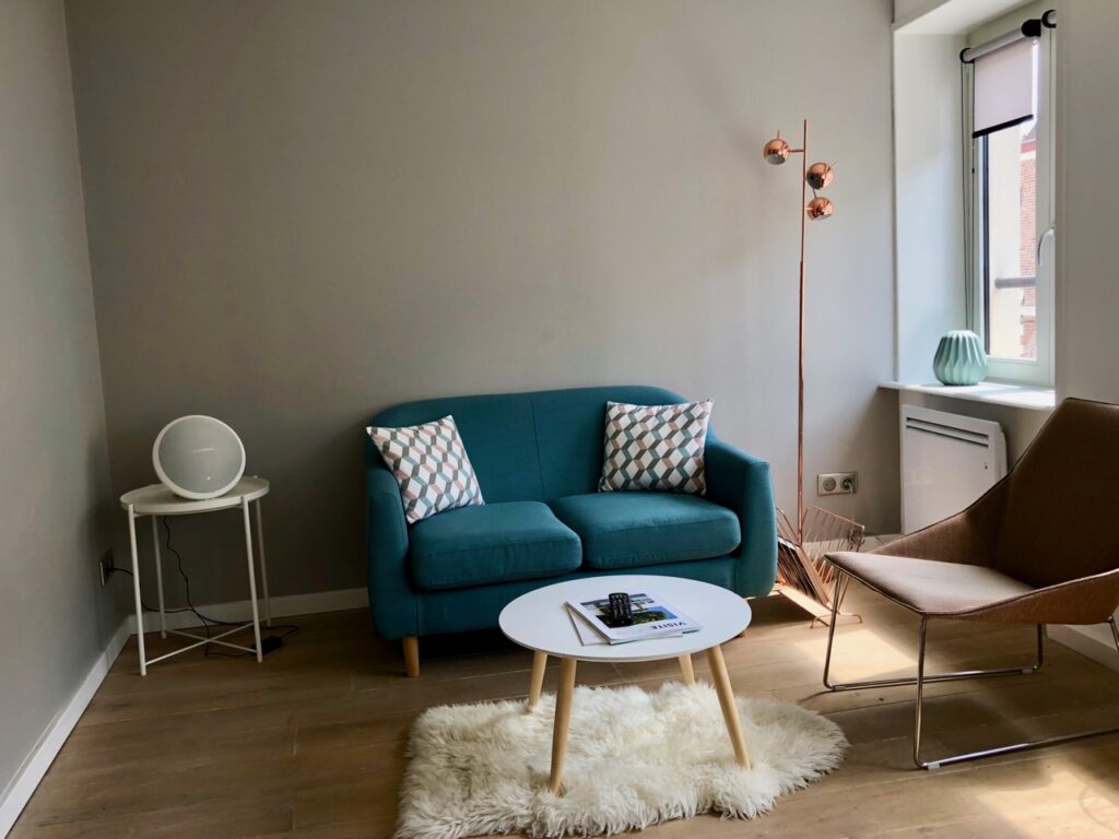 Au deuxième étage, voici Le Ptit Quinquin, 35 mètres carrés également, mais pour deux. Pas de brique ici mais une poutre apparente qui donne du charme au salon/séjour. Comme dans les autres hébergements, les hôtes bénéficient de la wifi ainsi que d’un système audio bluetooth de qualité.