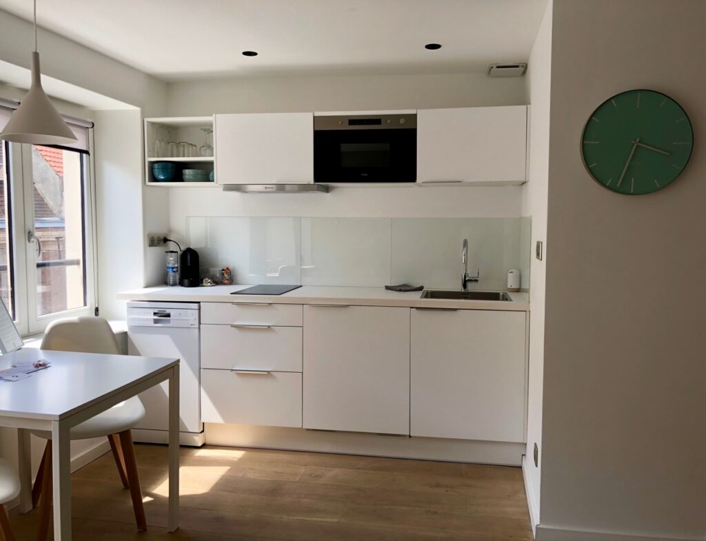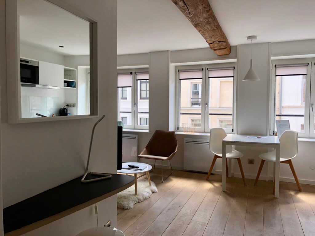 Je n’ai pas fait de photos de La Vieille Bourse, 35 m2 aussi, le seul appart des quatre à pouvoir accueillir quatre personnes, entre chambre et canapé lit pour deux.