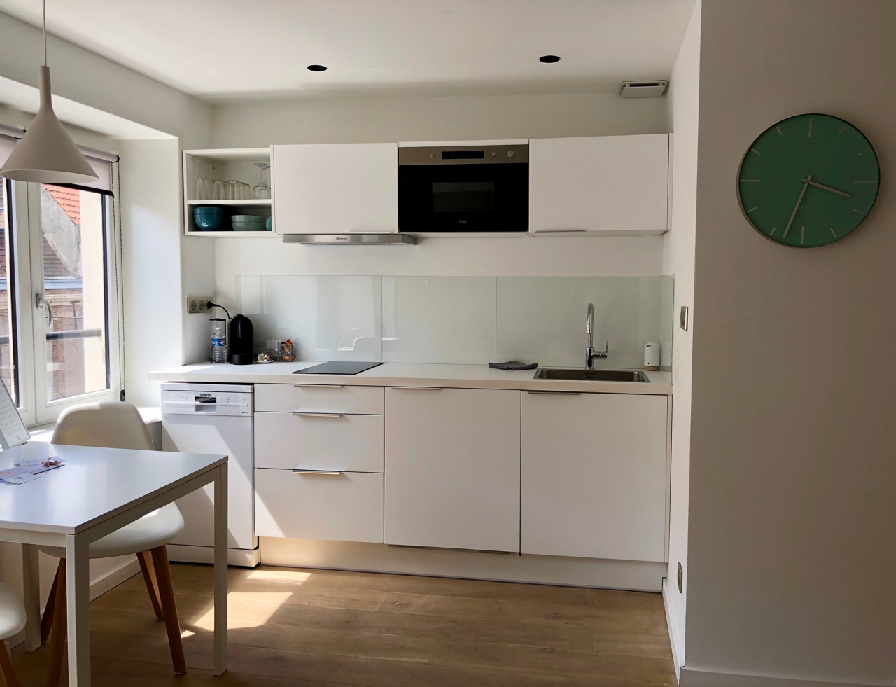 En face de ce mur plein de cachet, la cuisine tout de noir vêtue joue la sobriété la plus absolue. À peine quelques accessoires et petits plus, comme la cafetière Nespresso avec ses capsules (car sans, c’est un peu l’horreur !) Il y a aussi du thé Dammann Frères, preuve que Le Chat qui dort veut être une adresse de standing.