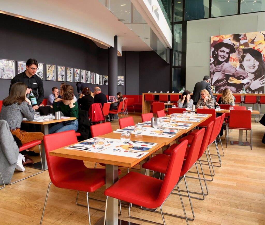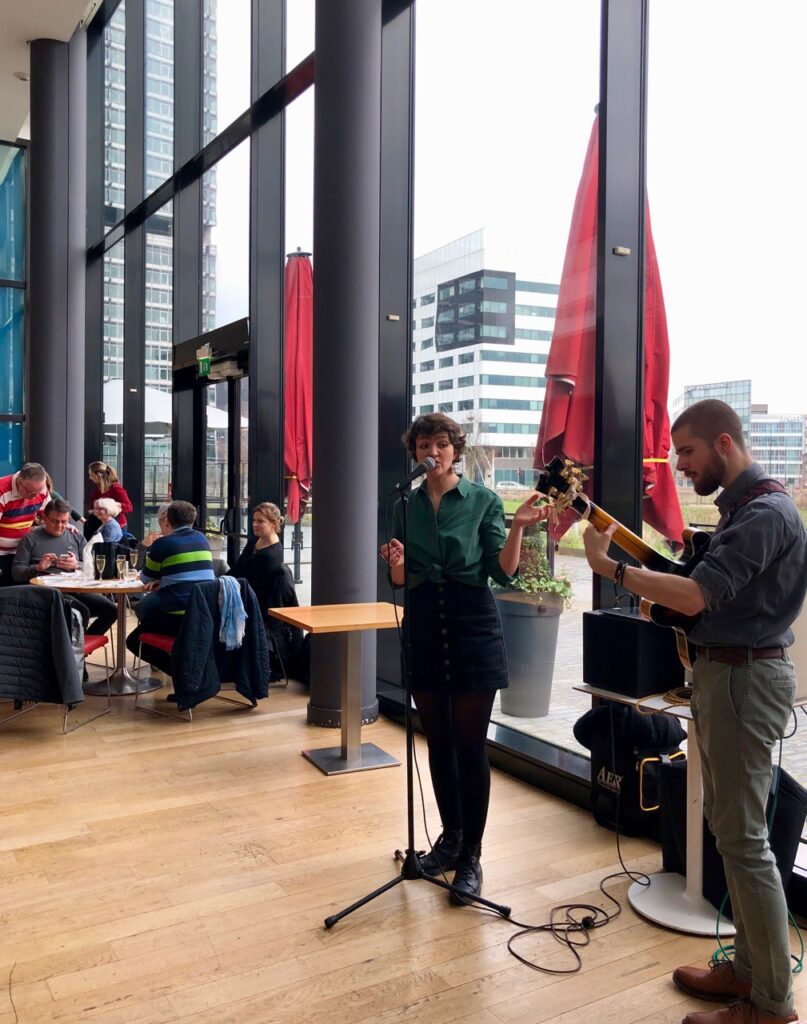 Aux beaux jours, on peut s’installer sur la terrasse (chauffée d’avril à septembre, vous savez à quoi peut parfois ressembler l’été ici…), face au parc des Dondaines. Mais pas question de prendre l’air en ce froid dimanche de janvier ! C’est donc dans la grande salle de La Terrasse du Parc que notre bande s’est installée, à deux pas du duo chargé de l’animation musicale.