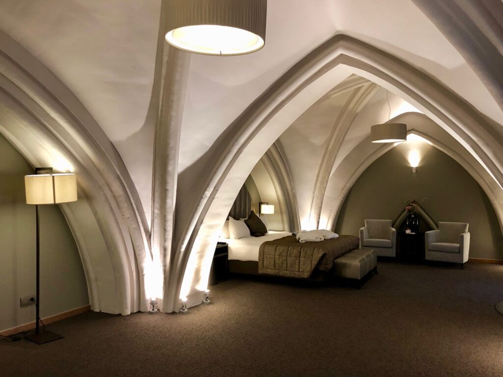 Dans les chambres du Martin’s Paterhof, les vitraux remplacent les fenêtres, tandis que les voutes structurent l’espace.