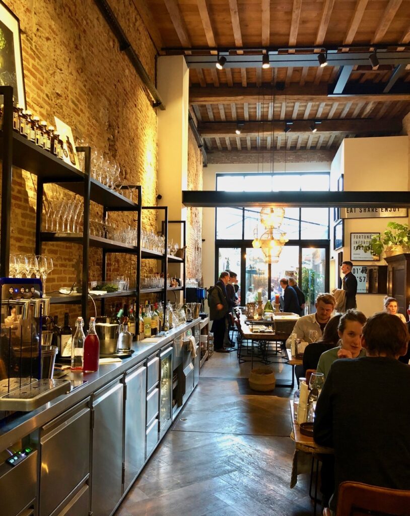 C’est l’un de mes coups de cœur, découvert lors de mon dernier séjour à Malines. Juste derrière l’hôtel de ville, De Fortuyne est un resto chaleureux et design, offrant des ambiances différentes. Nous avons dîné dans la première salle, avec son mur en brique, son plafond en bois et son beau parquet ancien. Une très belle ambiance, à la fois éternelle et dans l’air du temps. Juste relevée d’un fond de musique…