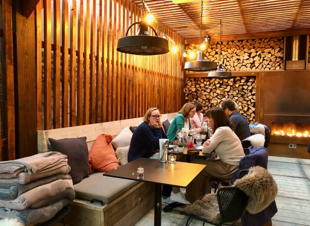 Derrière cette salle, une véranda puis une autre salle, super cosy avec sa cheminée, ses peaux de mouton et ses couvertures en libre-service. Ah, comme il doit faire bon se poser ici en plein hiver…