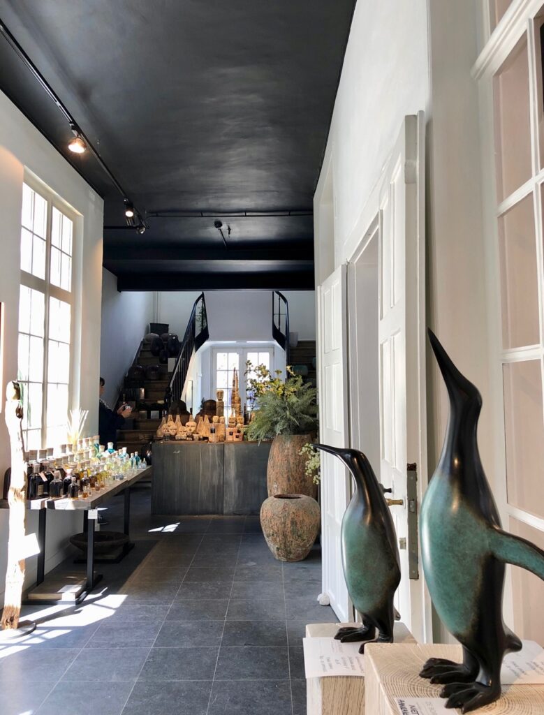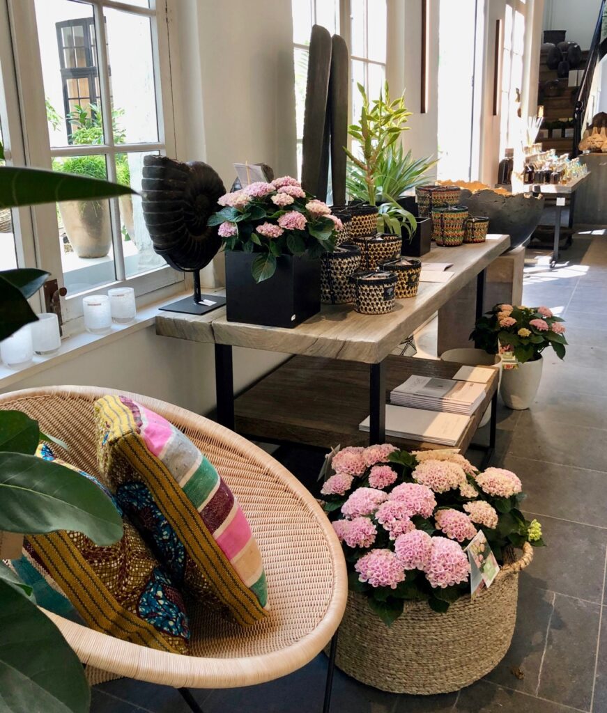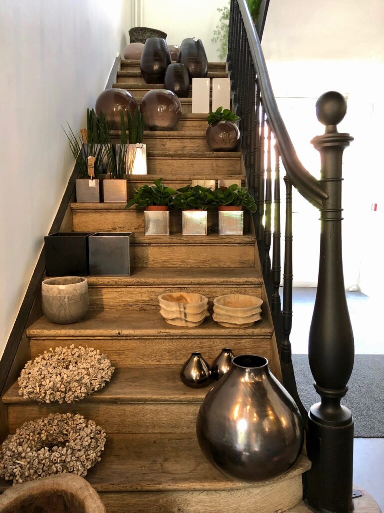 On croit entrer dans une boutique de déco, chez un fleuriste ou les deux à la fois. Objets d’art, céramiques, bougies, coussins, parfums d’intérieur, plantes et fleurs prennent leurs aises un peu partout, y compris sur l’escalier.
