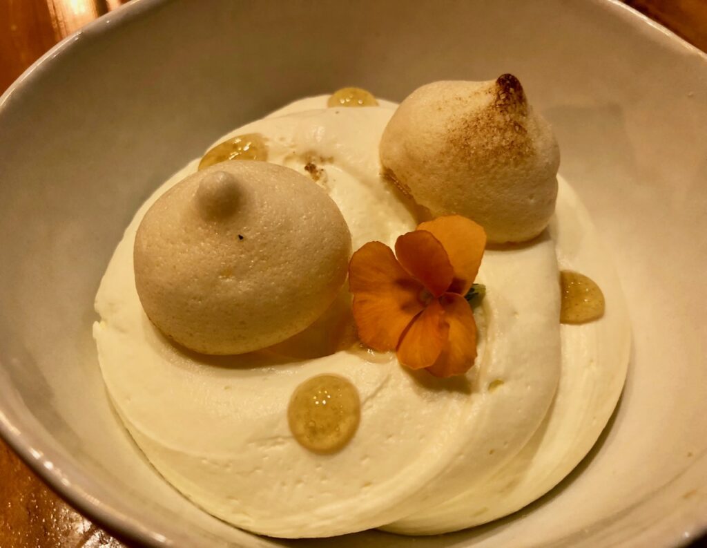 Verdict ? Cette (fausse) tarte était un ton en-dessous de l’entrée et du plat. Rien à dire sur le sablé et la prune (si, si !) au fond de la soucoupe, ni sur les petites meringues posées pour décorer le tout. Mais l’impression que le parfum du citron n’était pas assez présent et que l’ensemble manquait de ce côté acidulé et léger que j’attendais. Plutôt un dessert à la crème qu’une tarte au citron…