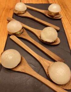 Un glaçon parfumé au wasabi, délicatement posé sur une petite préparation à base de haddock fumé.