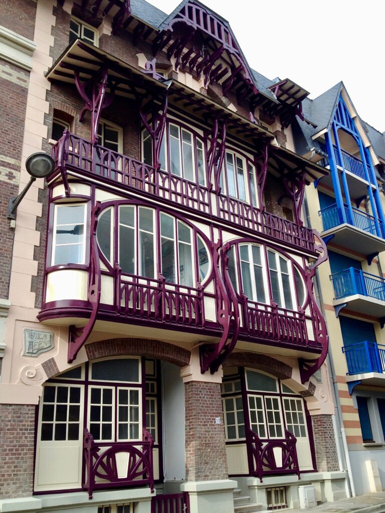 Hélène et Jan, les deux font la paire, comme souvent à Mers-les-Bains. Dès l’origine, beaucoup de propriétaires ont doublé la mise en achetant deux lots et en construisant des villas jumelles. L’une pour eux, l’autre pour la location… ou pour leurs amis s’ils étaient très aisés. Voyez comme l’ensemble a belle mine depuis que les deux villas ont été refaites. Arborant une jolie couleur aubergine, le grand bow-window et ses fenêtres très cintrées sont, eux aussi, typiques de l’Art Nouveau. C’est mon autre coup de coeur à Mers-les-Bains !