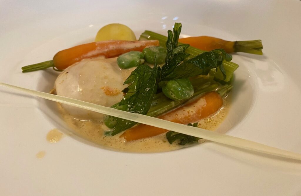 En plat, parfaite synthèse franco-belge, avec un waterzooï de volaille de Licques bio et ses légumes bio de Pierre Mortreux, le maraîcher de Neuville-sous-Montreuil des Mains noires. La sauce me laissera un souvenir ébloui …