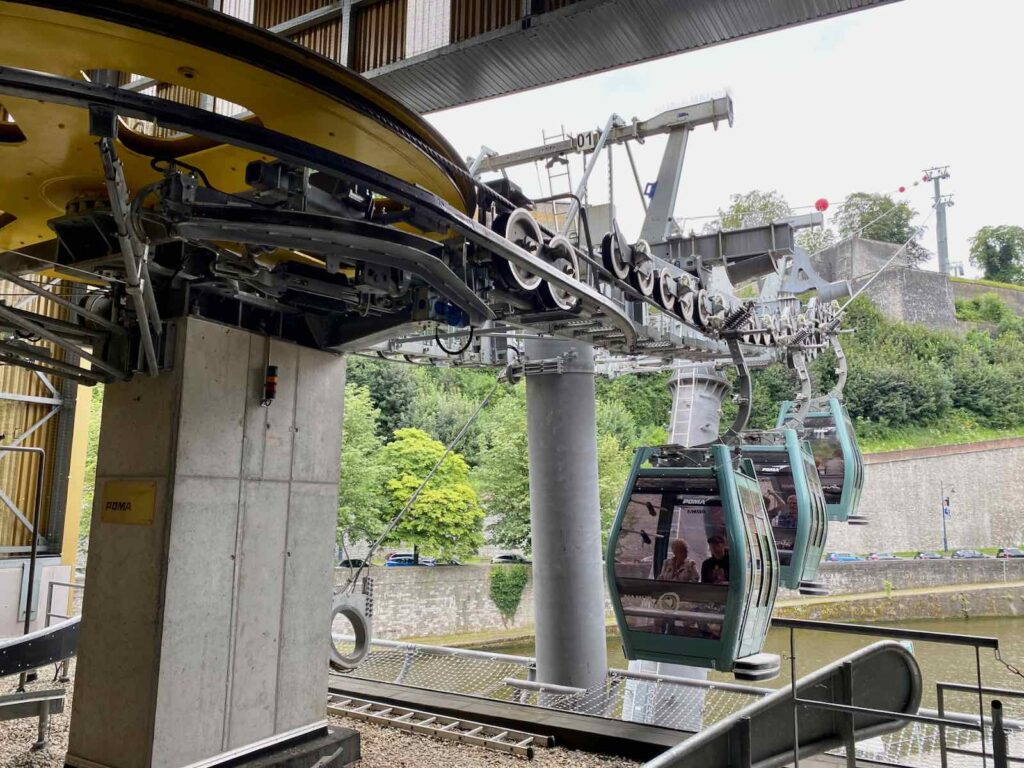 Après un saut de puce au-dessus de la Sambre, les cabines vertes s’élèvent en effet vers la fortification, posée sur un impressionnant éperon rocheux. Le voyage permet de profiter d’une vue panoramique sur toute la ville de Namur. Le beau bâtiment de la halle aux Bouchers qui abrite l’office de tourisme, le bâtiment contemporain du NID (Namur Intelligente et Durable), les églises, les ponts et passerelles, la nature au loin… la vue est à grand spectacle !