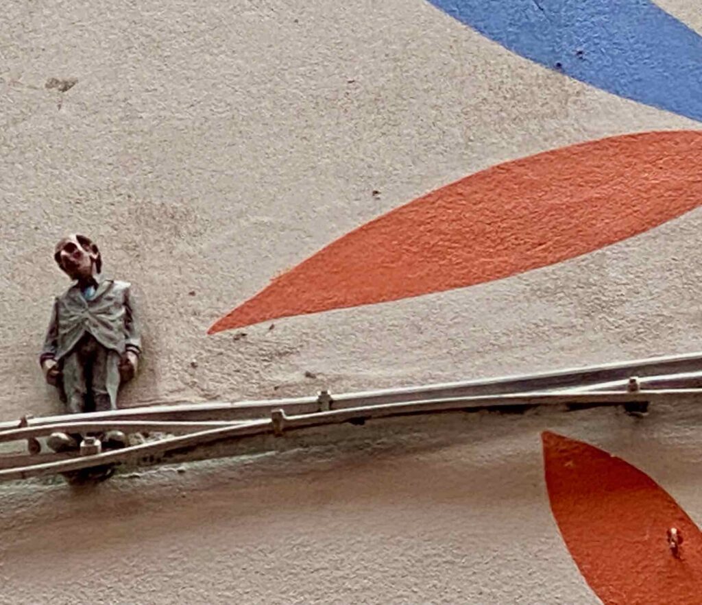 Parmi les œuvres  à dénicher entre deux briques, les petits bonhommes d’Isaac Cordal, toujours en costume cravate, que j’aime beaucoup. Une quarantaine de mini sculptures ornent ainsi les murs et invitent à une partie de cache-cache artistique !