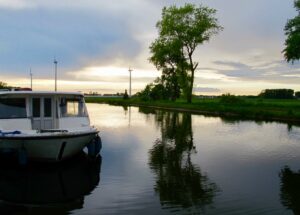 Belgique Nieuport Homeboat sur canal passendale sur fond d’éoliennes un soir d’été Au premier plan un autre bateau