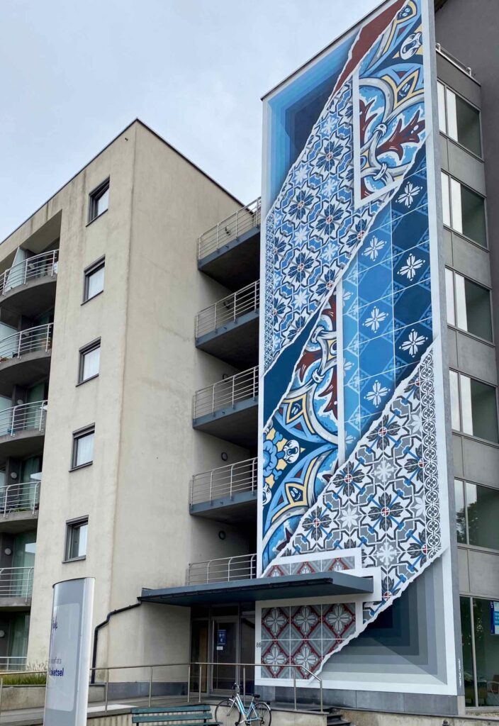 Je l’avais déjà repéré au festival Rouen Impressionnée. Le voici parmi les artistes de The Crystal Ship, à Ostende. À quelques pas de la mer, il se sert de la façade d’un immense et triste immeuble comme d’une toile. Et y fait courir un paysage (marin ?) abstrait, dans un joli dégradé de bleus. N’hésitez pas à vous éloigner du bâtiment pour saisir toute l’esthétique de l’œuvre !