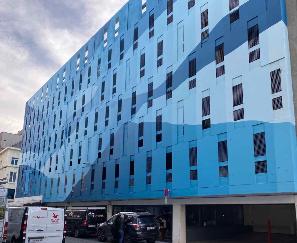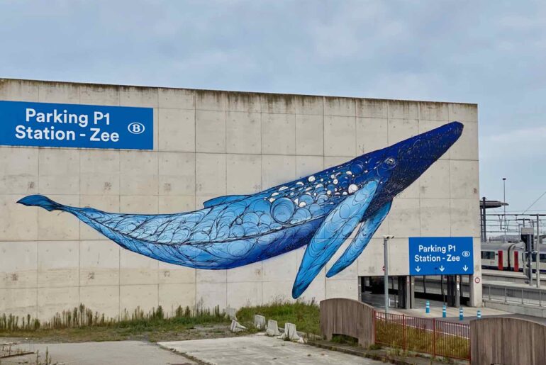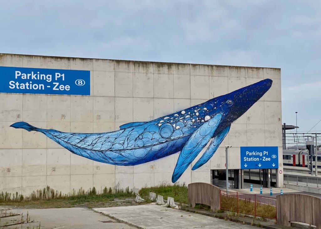 Vous aimez cette baleine, flottant sur la façade d’un parking derrière la gare d’Ostende ?