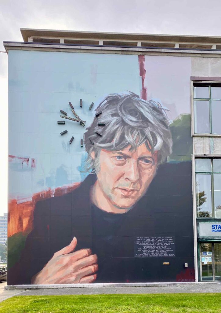 Cette œuvre, créée en 2020 par la Britannique Helen Bur, est un hommage à l’un des Ostendais les plus célèbres. Il s’agit du chanteur Arno, enfant terrible du rock, qui a déclaré un cancer du pancréas l’an dernier. Aujourd’hui en rémission, l’artiste a été à la fois très touché et satisfait du résultat. Il est vrai que s’afficher ainsi sur un mur de l’hôtel de ville est un sacré honneur !