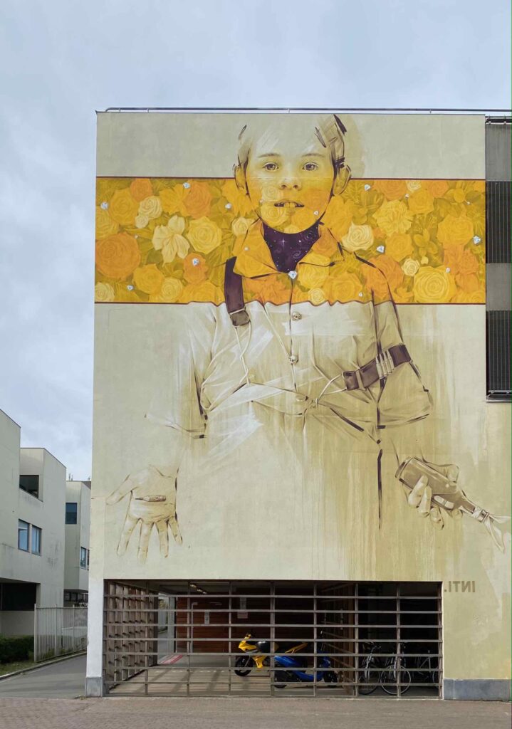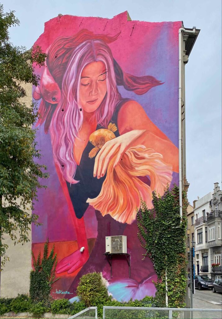 Encore une fresque murale signée The Crystal Ship que j’adore ! On la doit à la muraliste gantoise Kitsune, qui aime réaliser des portraits de femmes en mode XXL. Souvent dans des tons de rose, comme ces œuvres apposées sur 8 machines à laver Whirlpool, pour soutenir la lutte contre le cancer du sein. C’est doux, bienfaisant et ça apporte une poésie folle à cette rue un peu en retrait de l’hypercentre.