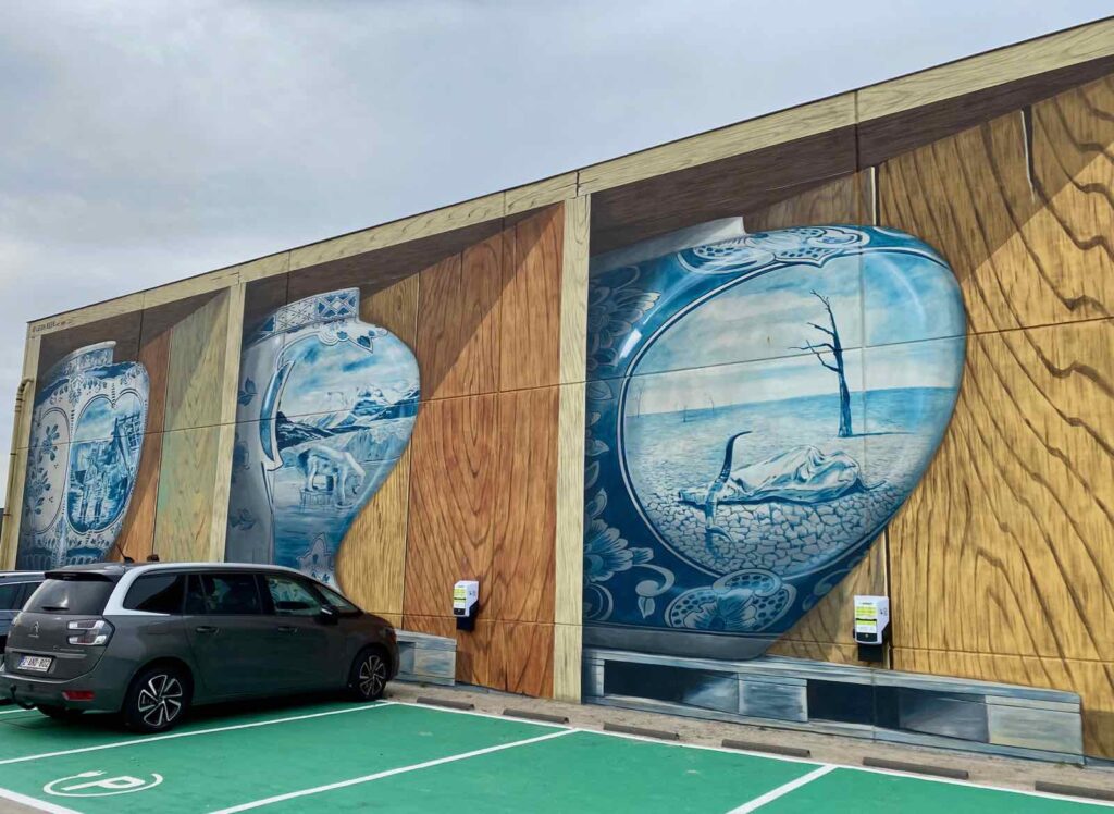 Ceux qui rêvent de découvrir cette fresque monumentale prendront le (petit) bac. L’œuvre du Néerlandais Leon Keer se trouve en effet sur l’Oosteroever ou rive est, qu’on atteint par l’eau… du moins en venant du centre-ville. Ce Delftois a mis en scène les typiques vases bleus et blancs. Du très traditionnel ? Pas vraiment puisque les motifs qui les décorent sont en quelque sorte des scénarios catastrophe… Sécheresse extrême, réchauffement climatique, tempête. Ce qui nous attend sans une vraie prise de conscience écologique…