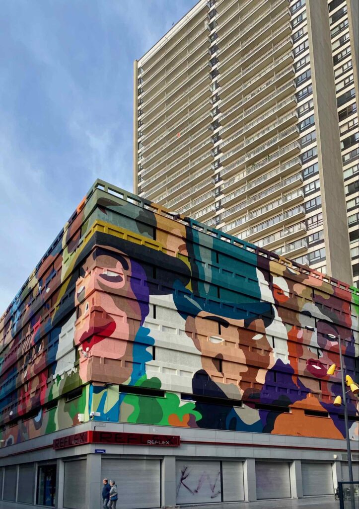 Cette œuvre monumentale est un peu la chouchoute de l’édition 2018 du festival, tant les médias en ont usé pour illustrer le dernier Crystal Ship. Il est vrai qu’elle est esthétique et également très bien placée sur une immense façade. Ce beau portrait de femme est l’œuvre de Dourone, un collectif constitué de Fabio, un Espagnol, et d’Élodie, une Française. Réalisé à partir d’une photo, ce visage veut évoquer la liberté, le respect et la diversité.