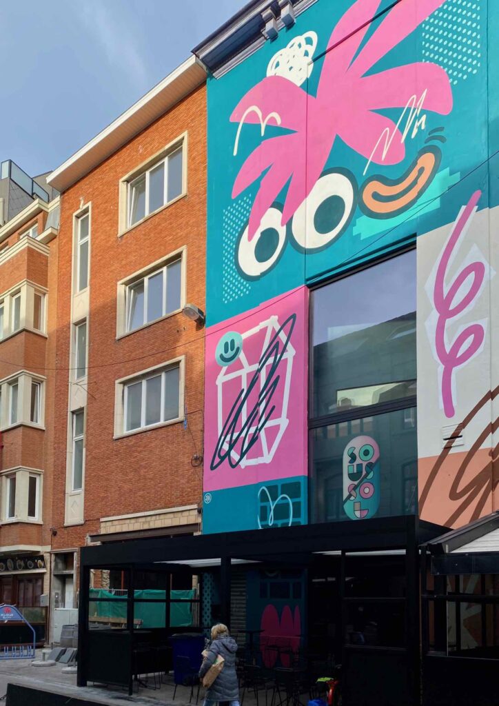 Derrière le pseudo de Toykyo, se cache non pas un artiste de rue mais un collectif, celui d’un studio de design gantois. Son style joyeux et coloré séduit, depuis une quinzaine d’années, des clients aussi prestigieux que Nike ou YouTube. Ici, dans la populaire Langestraat d’Ostende, c’est sur une haute façade de brique qu’il a mis sa touche « cartoon » et décalée. Perso, je n’aime pas plus que cela… mais mon avis n’engage que moi !