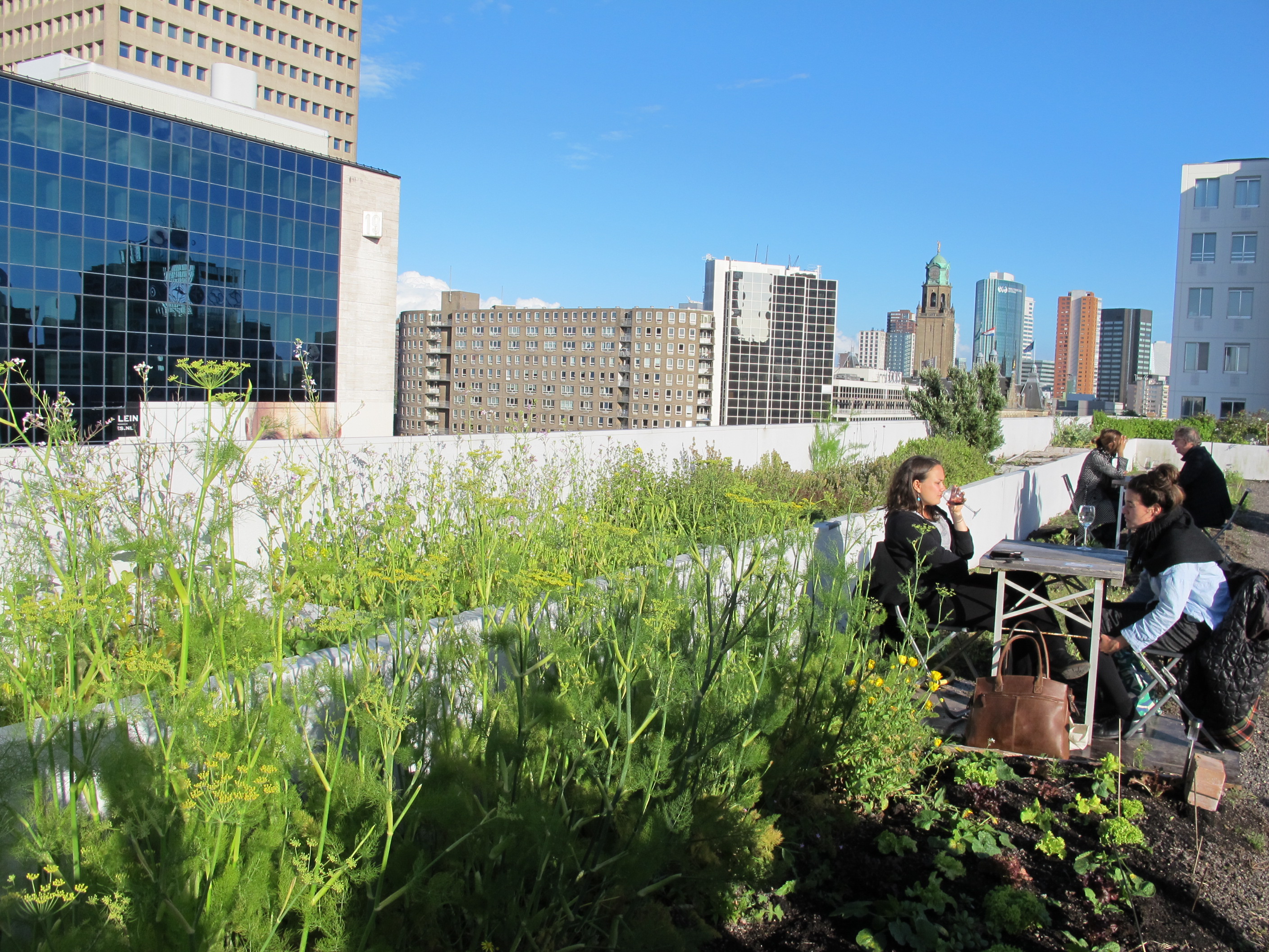 Rotterdam restaurant Op Het Dak terrasse toit avec vue sur skyline