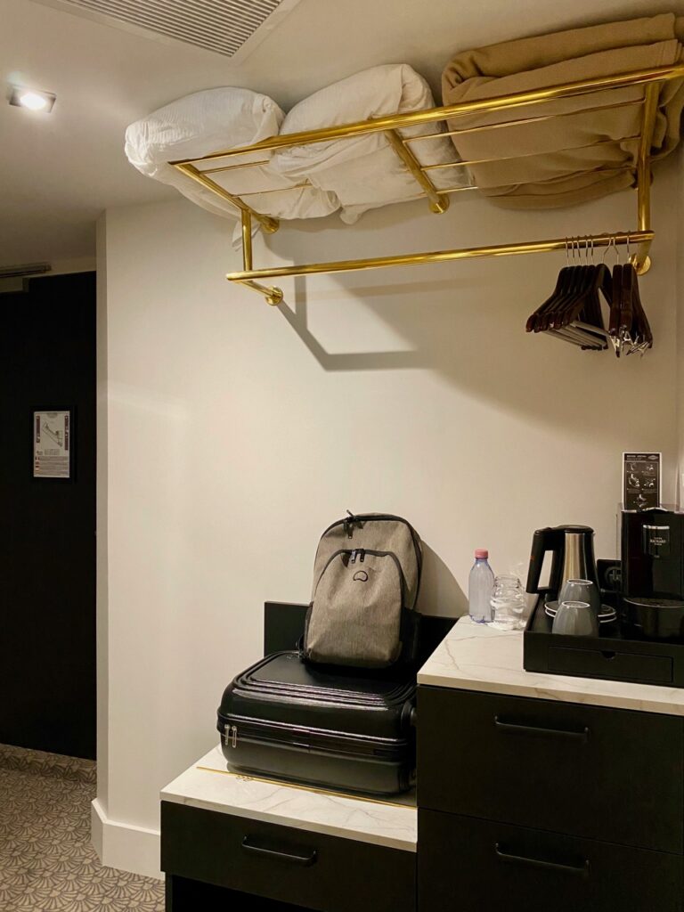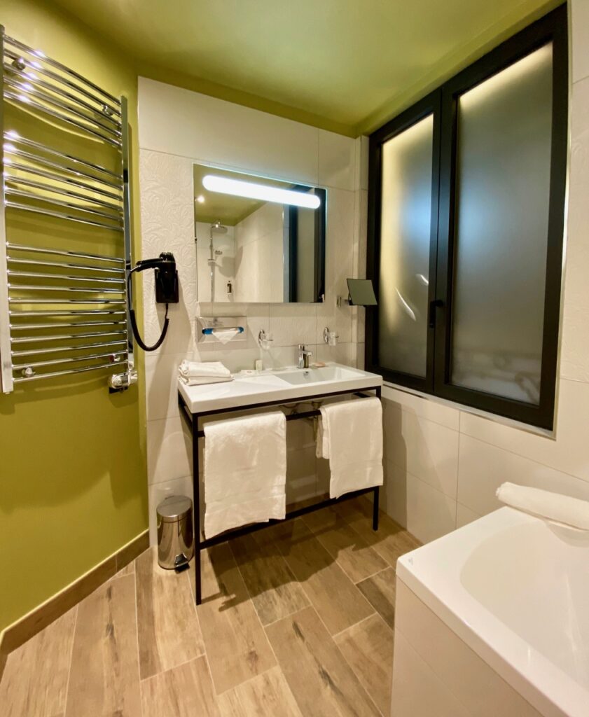 L’hôtel a été rénové de la cave au grenier et j’ai eu l’occasion, au printemps 2019, de voir l’important chantier. C’est donc avec d’autant plus de plaisir que j’ai découvert l’établissement dans ses habits neufs. Trente-sept chambres joliment relookées dans « un esprit Art Déco revisité et rajeuni », comme l’annonce le site de l’hôtel. En petite veinarde que je suis, j’ai été surclassée en (grande) chambre supérieure donnant sur la gare de Rouen by night…