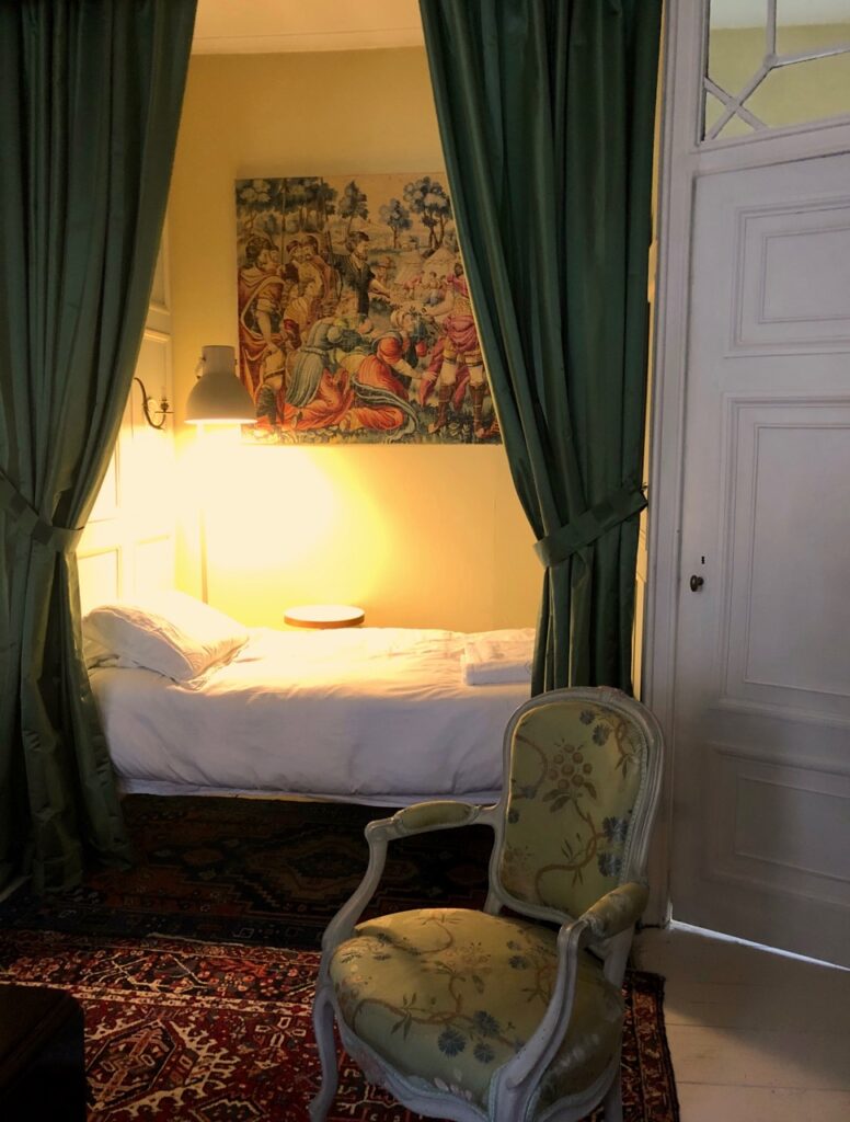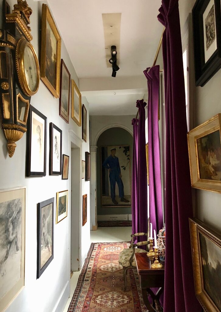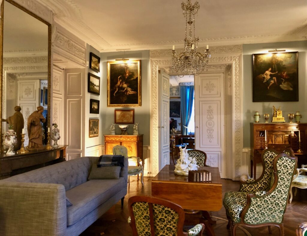 En attendant l’aménagement d’un appartement 1930 au dernier étage, on explore le premier, où les chambres sont restées telles qu’au XVIIIe, avec lit en alcôve, tapis et tapisseries. Tandis que le couloir a de petits airs de galerie de peinture, avec ses murs couverts de tableaux.