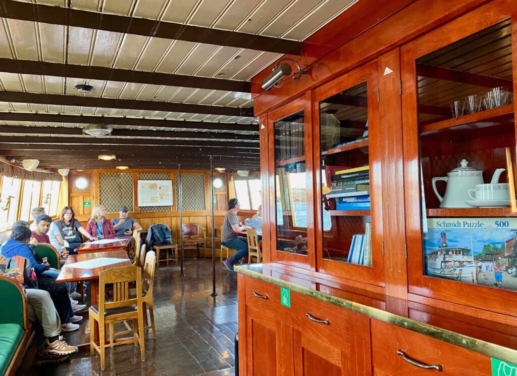 Ce jour-là, la croisière s’est faite sur le MS Östana, un bateau traditionnel plein de charme, datant de 1906. Salon, salle à manger ou pont, l’ambiance est différente selon l’endroit du navire où on se pose.