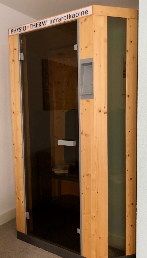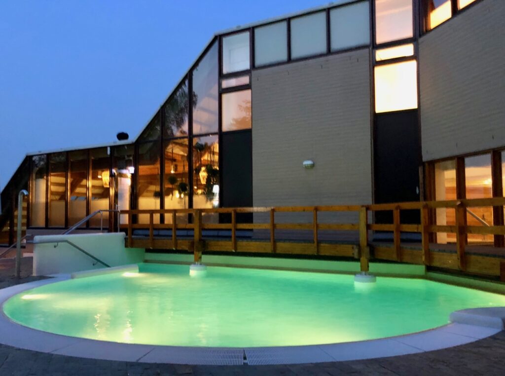 Pour sa lumière bleutée, presque violette, j’ai beaucoup aimé celui-ci, situé à l’intérieur. Après le bain, on se pose dans un fauteuil à bascule, qui surélève les jambes et relance la circulation…