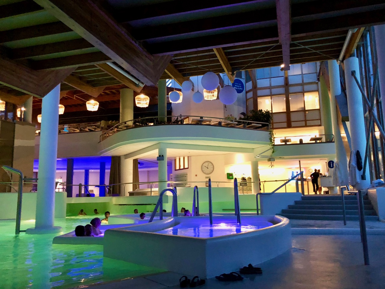 Il y a au total une demi-douzaine de bassins, extérieurs ou intérieurs, à des températures différentes, variant entre 19° (comme dans la mer du Nord en été…) et plus de 30°. Avec, dans certains, jacuzzi et/ou lit massant.