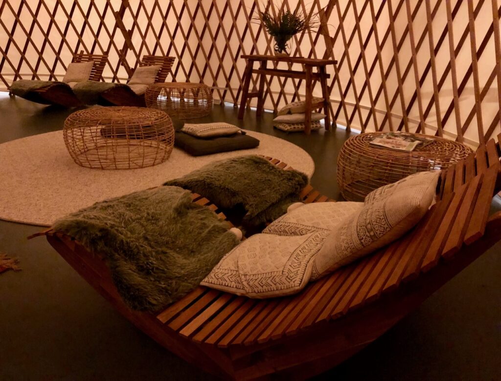 L’autre truc super, c’est la yourte, située en sous-sol. Une vraie yourte avec de jolis fauteuils pour se reposer et des couvertures en (fausse) fourrure pour se cocooner.
