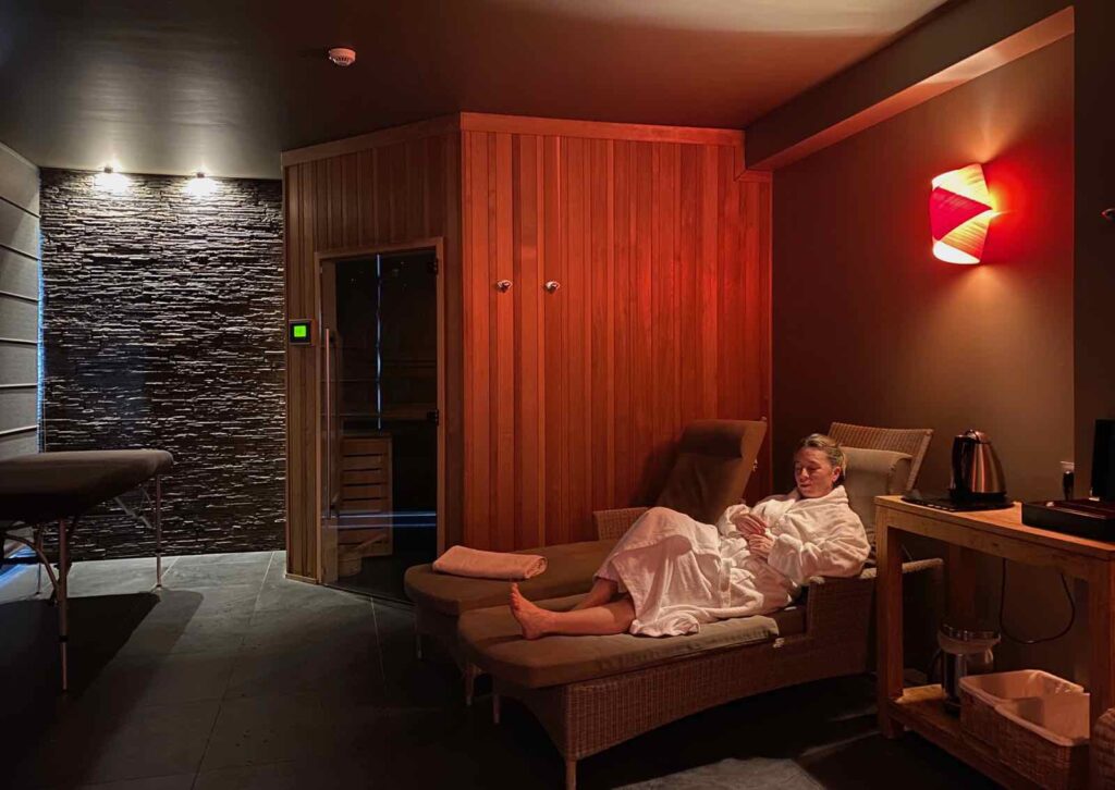 Il me reste une heure avant le dîner. Juste le temps d’aller faire un tour au spa, me réchauffer entre sauna et hammam et faire une petite causette, en peignoir, avec une autre voyageuse, embarquée sur L’Atlantic…
