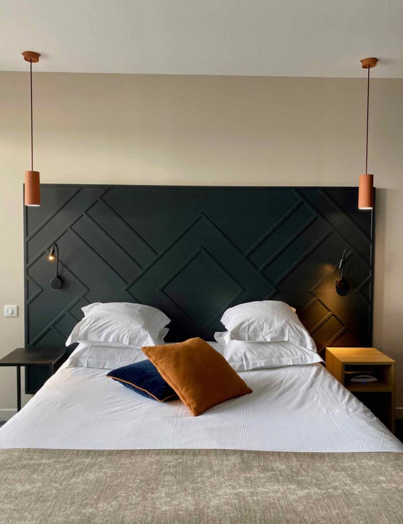 Les couleurs de la chambre répondent en écho à celles du somptueux paysage, de l’autre côté de la baie vitrée. Bleu, sable, gris, bois clair… la palette choisie par Lucie Dinielle, qui a repensé récemment la déco, est en harmonie totale avec les nuances changeantes de la mer. Franchement, j’adore, et je reste un moment, debout près du lit, juste à ressentir cette belle harmonie.