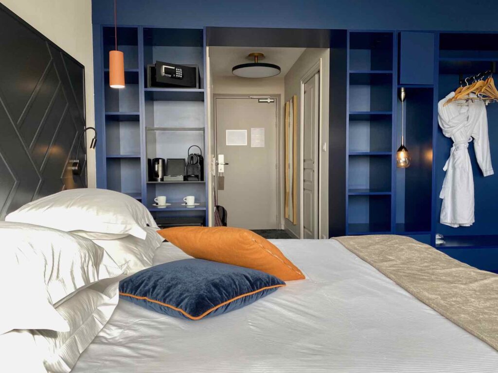 La chambre est spacieuse et bien équipée, avec de nombreux rangements bleu azur… pour les jours de grand bleu sans doute.