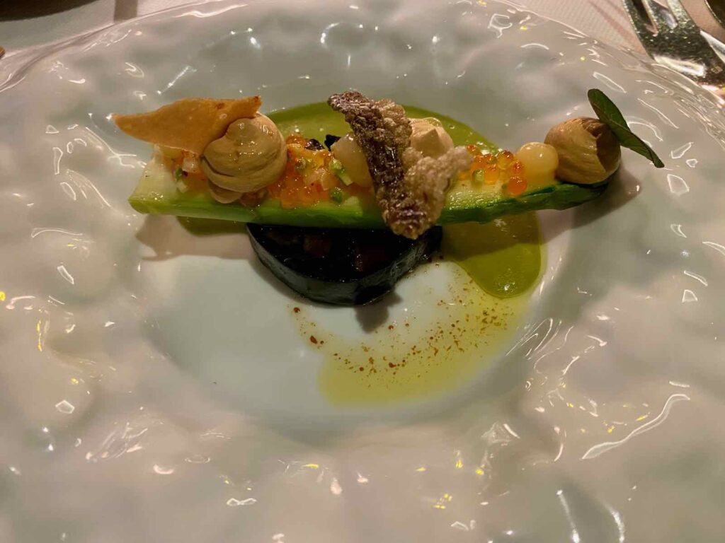 En première entrée, il a donc servi ses « Asperges de Pertuis, truite, chicorée et yuzu ». Un mariage plutôt audacieux, dans lequel j’ai particulièrement aimé le goût de la chicorée, caché dans les petits monticules crémeux.
