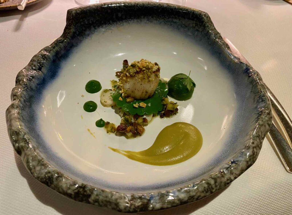 Comme son père Alain avant lui, Benjamin Delpierre, amoureux de son territoire, s’approvisionne directement auprès de trémailleurs (notamment en soles, tourteaux, bulots, homards…) mais aussi auprès d’un mareyeur local, qui achète la pêche du jour à la criée boulonnaise. C’est sans doute de là que venaient les coquillages du plat suivant, « Coquilles Saint-Jacques, pistache, pomme, persil », servi dans une magnifique assiette, bien dans le thème.